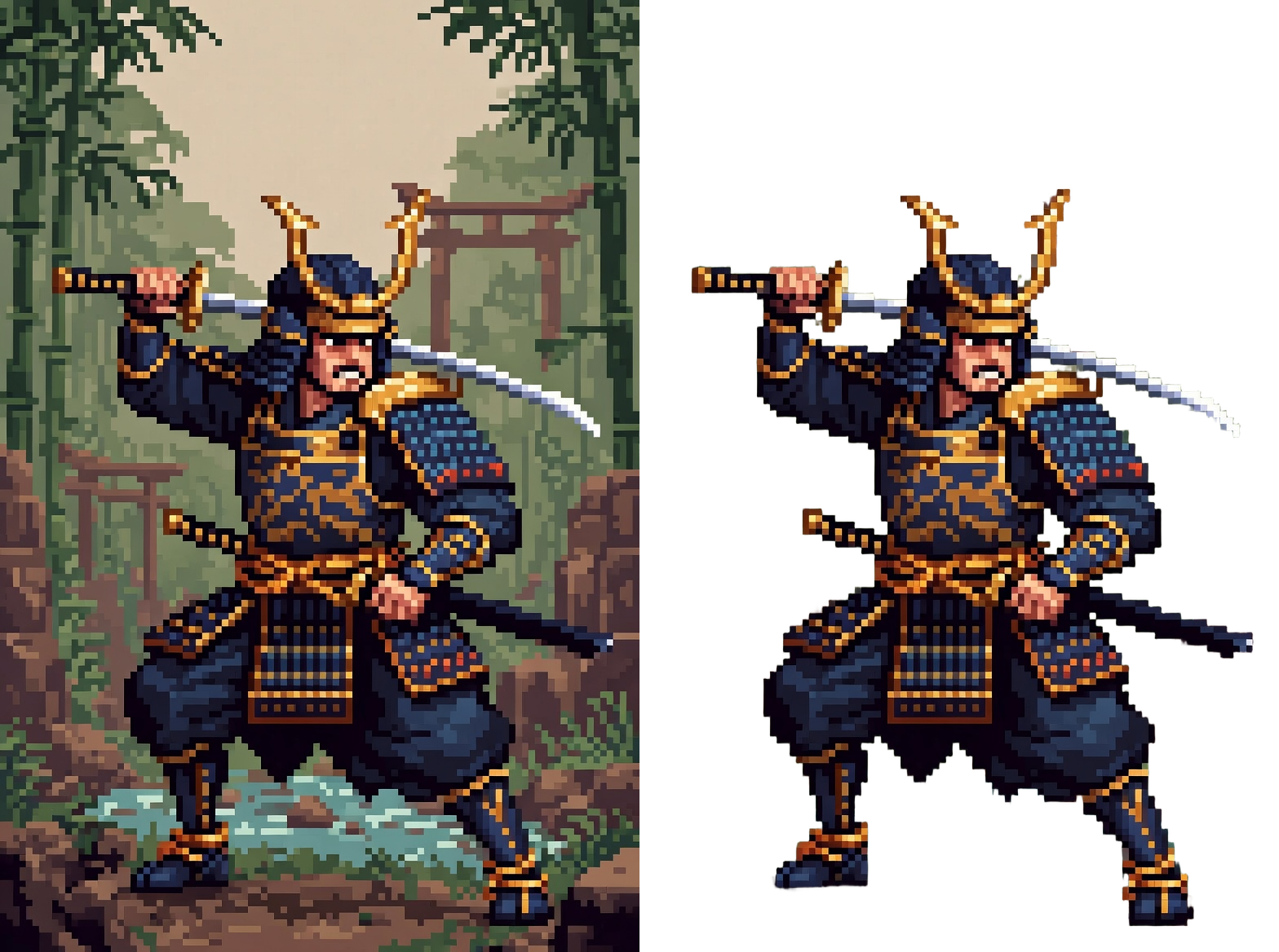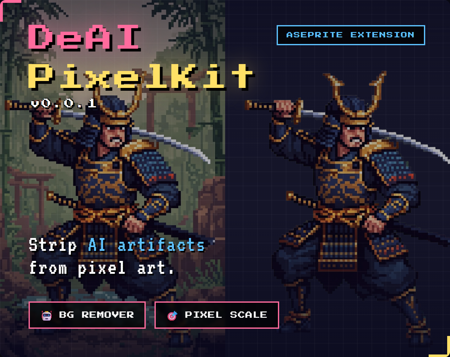 AI image generators churn out "pixel art" that looks pixelated at a glance — but zoom in and you'll see fuzzy edges, inconsistent block sizes, and noisy backgrounds. DeAI PixelKit is an Aseprite extension that fixes that. Two tools, one click, runs locally. No cloud, no API keys, no Python.